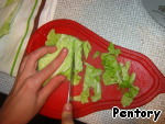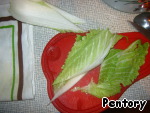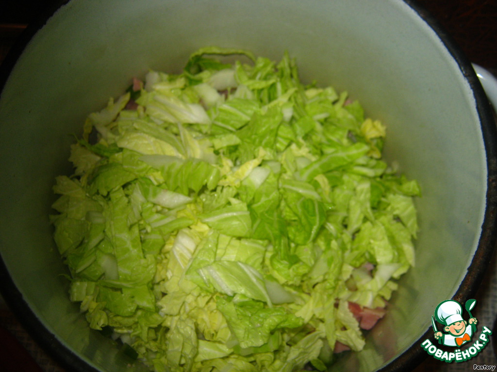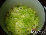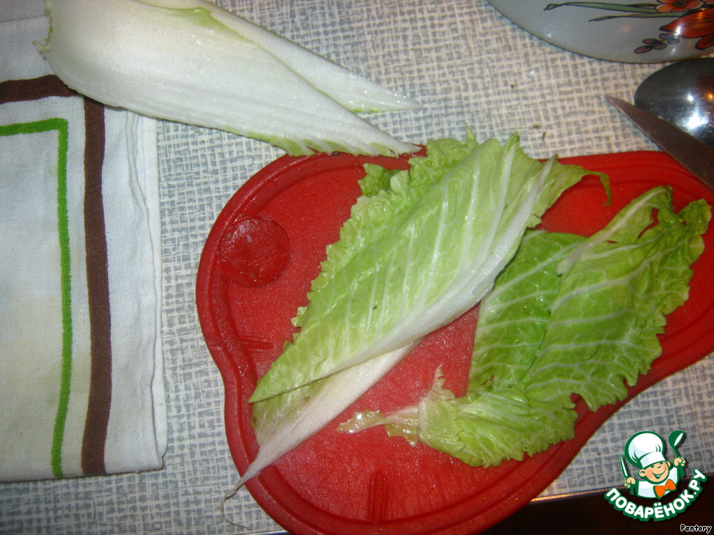 Капусту моем, пусть обсохнет, режем вдоль и поперек, как нравится, полосочками (срезаем только зеленые листочки по бокам).