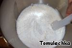 К полученной массе добавляем муку, и аккуратно перемешиваем лопаткой, чтобы не испортить пену.