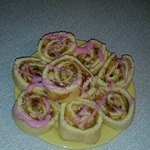 Тесто должно быть примерно о,5 см толщиной. Оно немного поднимется и будет около 1 см в готовом виде. Такое тесто в полотенце легко сворачивается. Но, надо сворачивать именно горячим, сразу, как только сняли с противня.