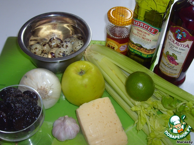 Сверху посыпать тертым сыром, полить заправкой. Украсить перепелиными яйцами и зеленью сельдерея.