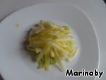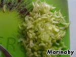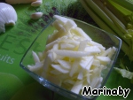 Я делала салат порционно – нижний слой сельдерей, поливаем заправкой, второй слой - перышки лука, также полить заправкой.