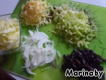 Трем твердый сыр на крупной терке, режем соломкой чернослив. Все ингредиенты выглядят так.