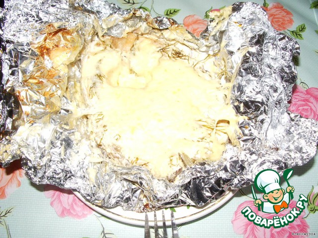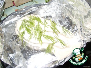 Из фольги делаем "тарелочку", выкладываем рыбку, вливаем 50 мл сливок, сбрызгиваем лимоным соком и сверху кладём веточки укропа.