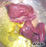 На топленом сливочном масле слегка обжариваем куриную печенку. Вливаем 2 ст.л. бульона или воды и тушим на маленьком огне до побеления печени. -