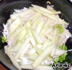 2 слой: нарезать тонкими кольцами лук, обдать его кипятком и отжать. Выложить поверх салата и полить соусом.