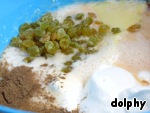 Добавьте сахар, 40 г растопленного масла, уксус, ванилин, изюм, корицу и мускатный орех, сметану. Перемешайте ложкой.