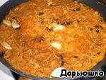 Добавить томатную пасту, нут, чернослив, чеснок. Перемешать.