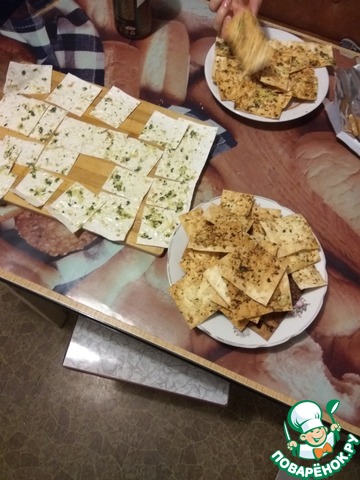 Делала и просто с солью и чесночным маслом, и с добавлением укропа, и со специями(смесь перцев, чеснок и травы), а ещё попробовала обмазать квадратики лаваша смесью растительного масла с сахаром-получились сладкие хрустики, детям очень понравились.