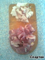 Режем средними кусками курдюк и мясо. Разогреваем казан и кладем курдюк (без масла). Поджариваем до корочки и кладем мясо.
