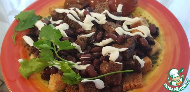 Кусочки хлеба обжарить на подсолнечном масле, натереть с обоих сторон чесноком и порезать на маленькие кубики.