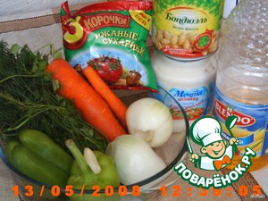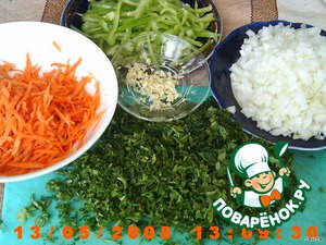 Ингреденты жарим: вначале лук, добавляем морковь (жарим под крышкой 3-5 мин), после добваляем болгарский перец, тушим все еще мин 7-10.