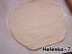 Отрезать небольшой кусочек теста. А оно получается очень мягким. И лучше его на столе не оставлять, а положить в миску, все-таки оно на растительном масле. Раскатать.