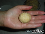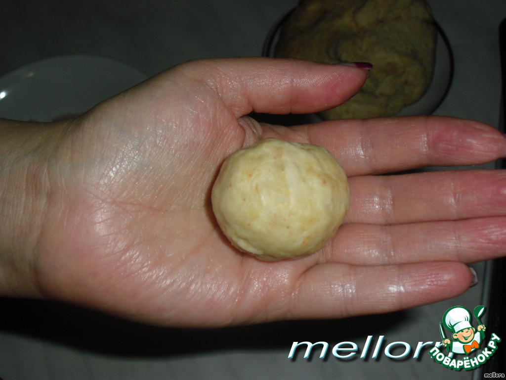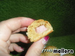Тесто разделить на шарики. Руками размять каждый шарик, на середину выложить кубик ветчины. -