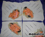 Сверху кладем по ломтику сёмги. У меня была обрезь, оставшаяся от засолки. Это совершенно не повлияло на вкус пирожков.
