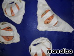 Сворачиваем тесто треугольником, скрепляем края, слегка смазав их водой. А затем свободные концы треугольника соединяем наподобие пельменя. Получаются ракушки. Смазываем их желтком и выпекаем в духовке на среднем огне в течение 20 минут.