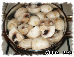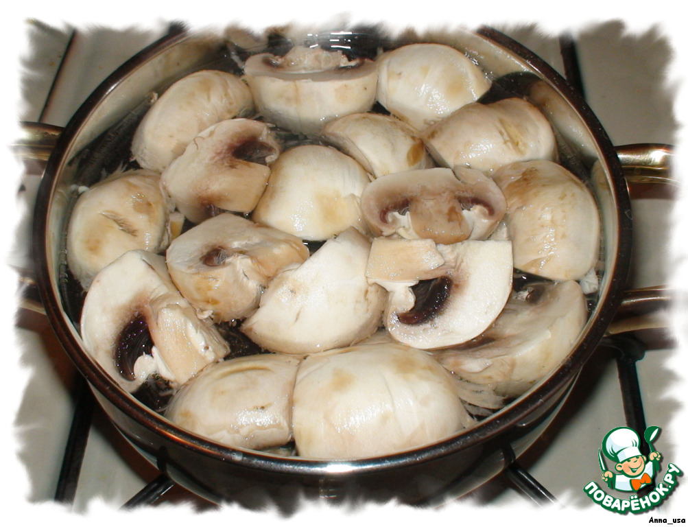 Шампиньоны бросить в кипящую подсоленную воду и отварить буквально пару минут. Если грибы крупные, можно разрезать пополам, если маленькие то оставить целыми. Слить воду.