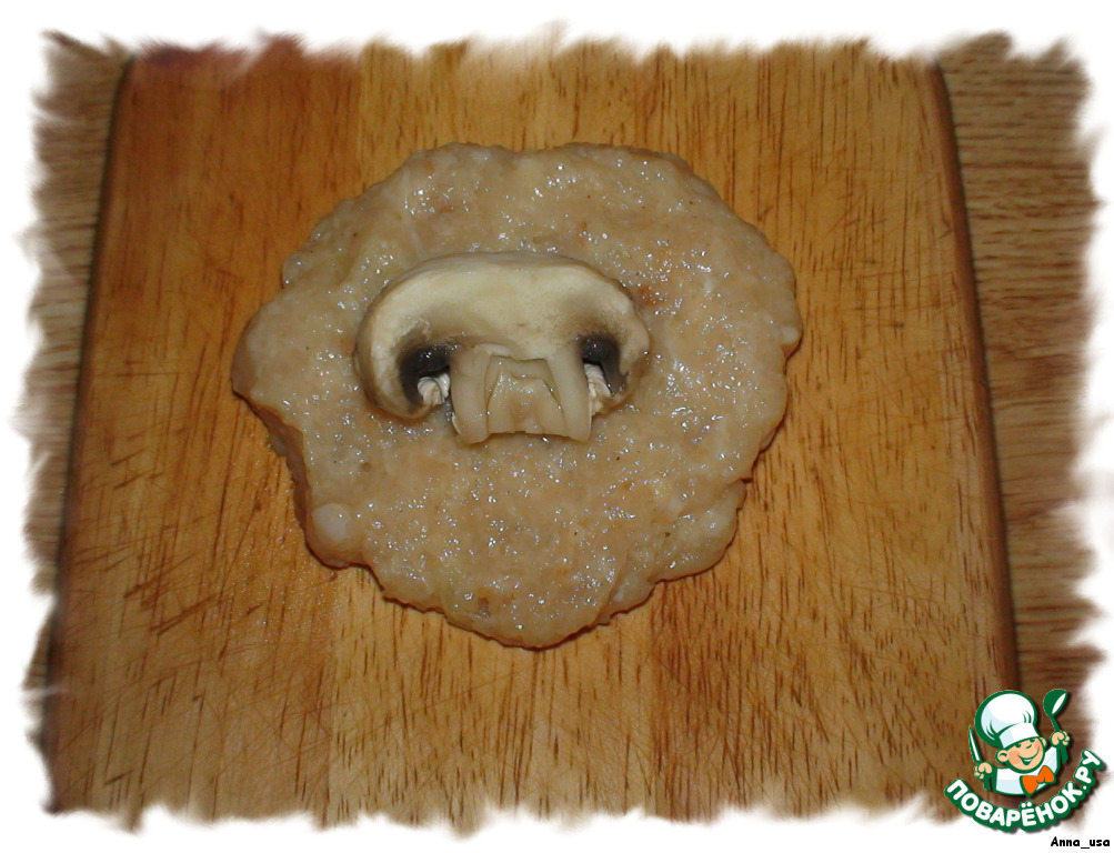 Из фарша сделать небольшой блинчик и сверху положить грибочек, загнуть края и сформировать котлету. Всё это делается в руке, предварительно смочив руки холодной водой.