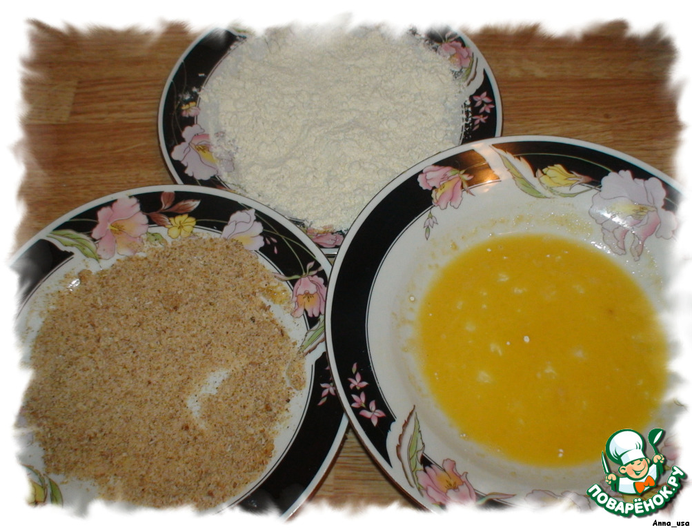 Обвалять сначала в муке, потом в яйце и в сухарях.
