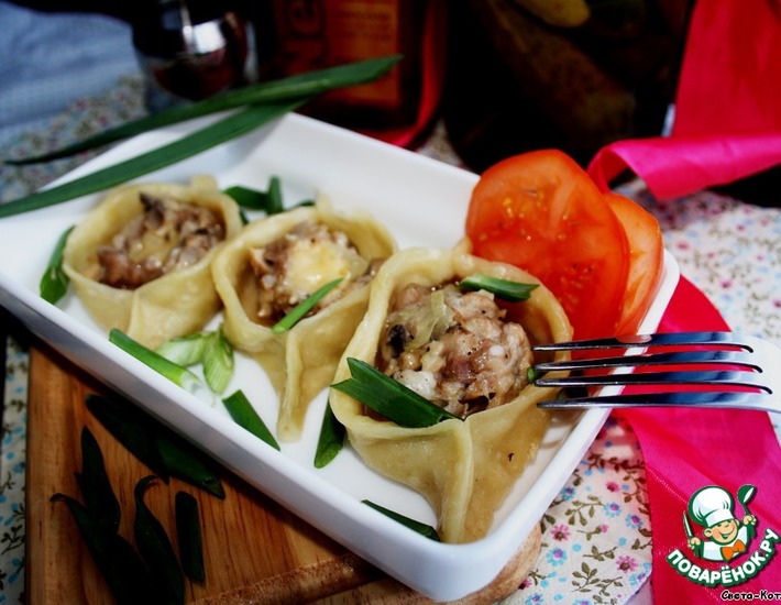 Вкусные, сочные, «открытые» манты из нежного куриного мяса, грибов и сыра. В оригинальном исполнении.