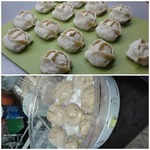 Из теста раскатываем тонкие сочни. В центр выкладываем начинку. Защипываем края. В центр начинки помещаем небольшой кусочек сыра.