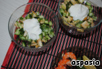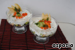 Я решила, что лучше всего салат-коктейль будет смотреться в креманках. Раскладываем половину нашего салата по креманкам. Добавляем сметану. Почему? Маложирная, низкокалорийная...
