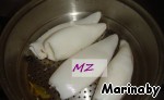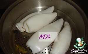 Тушки кальмара почистить и опустить в кипящую, подсоленную и приправленную лавровым листом, и душистым перцем, воду. Через две минуты выключить и 5 минут подержать кальмары в горячей воде под крышкой.