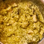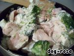 В посуду для тушения выкладываем курицу (при желании можно ее предварительно чуть обжарить на растительном масле), брокколи (я оставила несколько соцветий для украшения, проварив их до готовности), сметану, специи.
