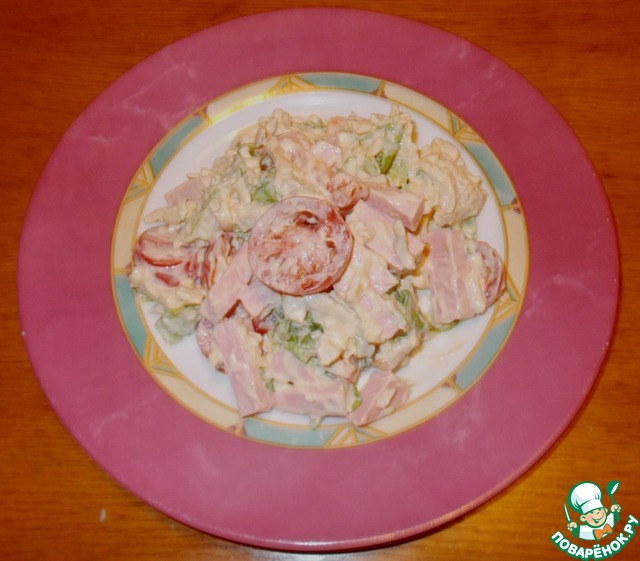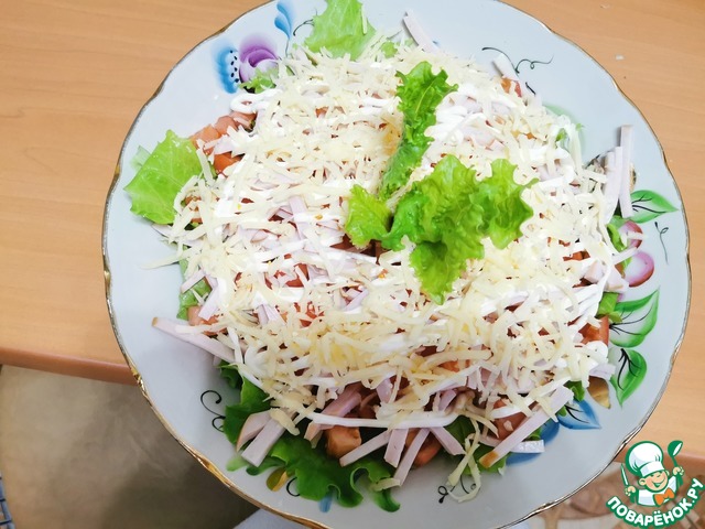 Отварить куриную грудку. Остудить. Мелко порезать. Ветчину нарезать соломкой. Помидоры - кубиками. Листья салата порезать или порвать руками. Сыр натереть на мелкой терке. -