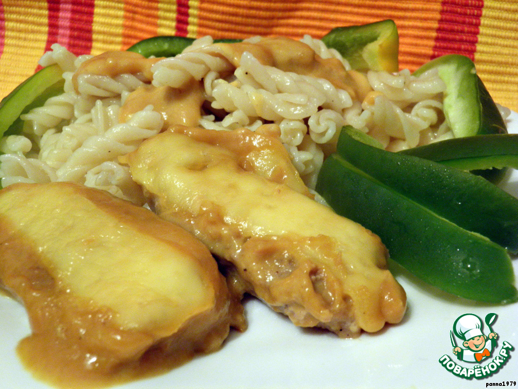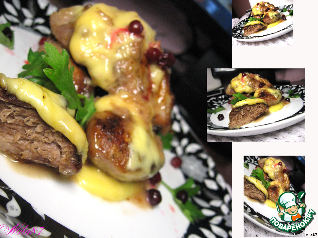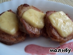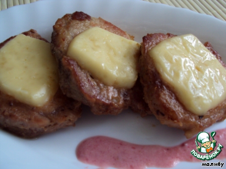 Выложить кусочки сыра на свиные медальоны и залить соусом.