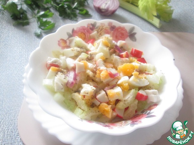 Вареное яйцо мелко рубим, посыпаем наш салат.