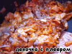 Лук и грибы нашинковать тонко. На растительном масле обжарить лук, добавить грибы, обжаривать вместе минут 5.