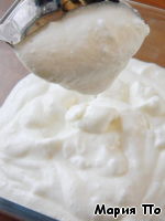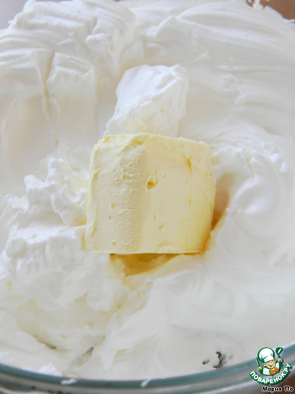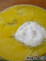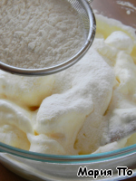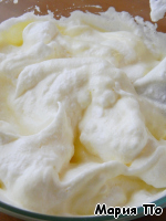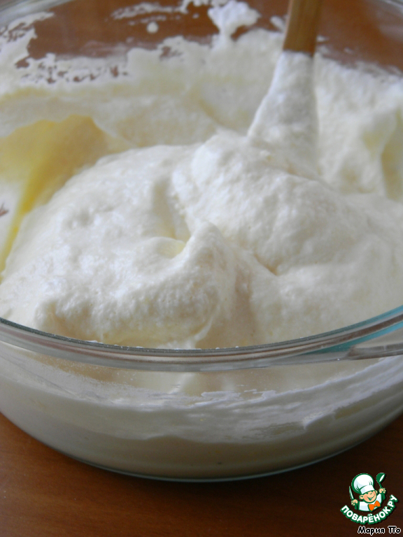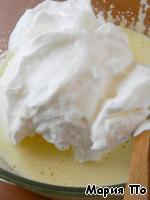 Отдельно взбить белки с ложкой сахара до крепких пиков. Ввести к желтковой массе.