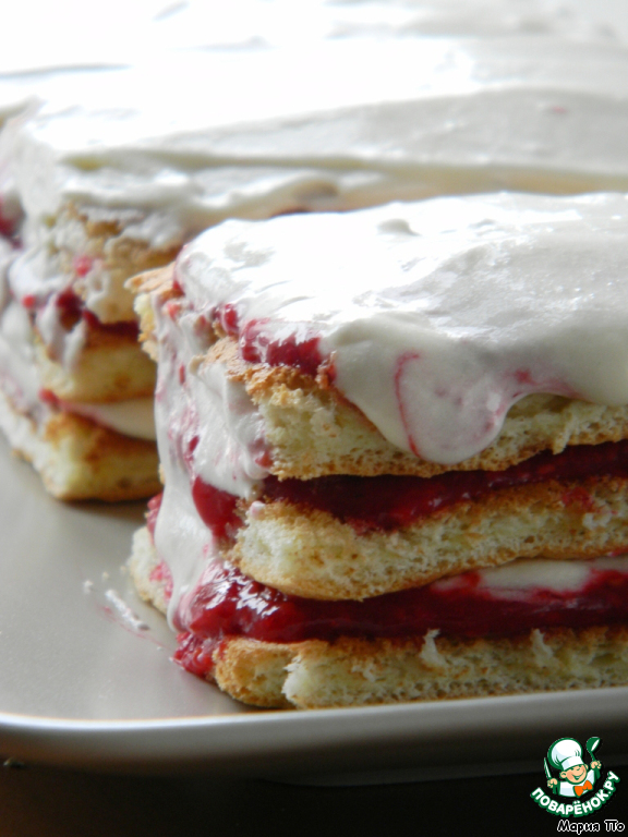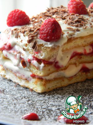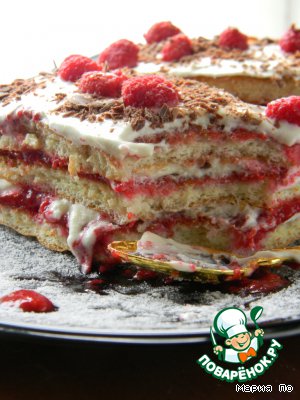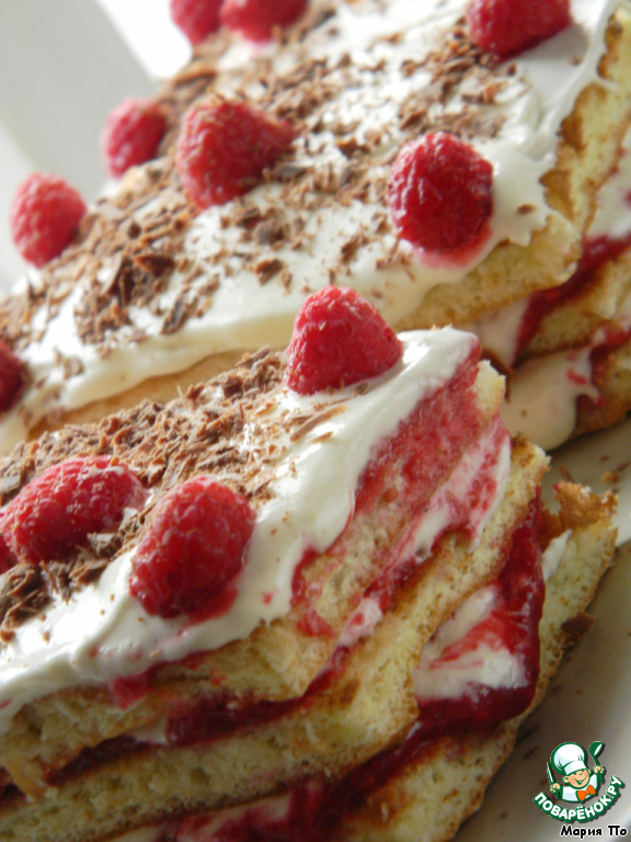 Мягкий бисквитный корж с прослойками из ягод малины и нежного сливочного крема.
