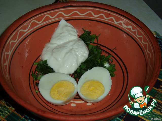 В тарелку кладем порезанное вареное яйцо, мелко порезанную зелень, сметану и наливаем горячие щи.