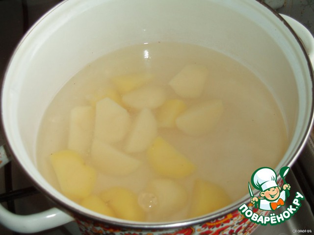 Воду довести до кипения, картофель почистить, порезать кусочками, положить в кипящую воду и варить до готовности.