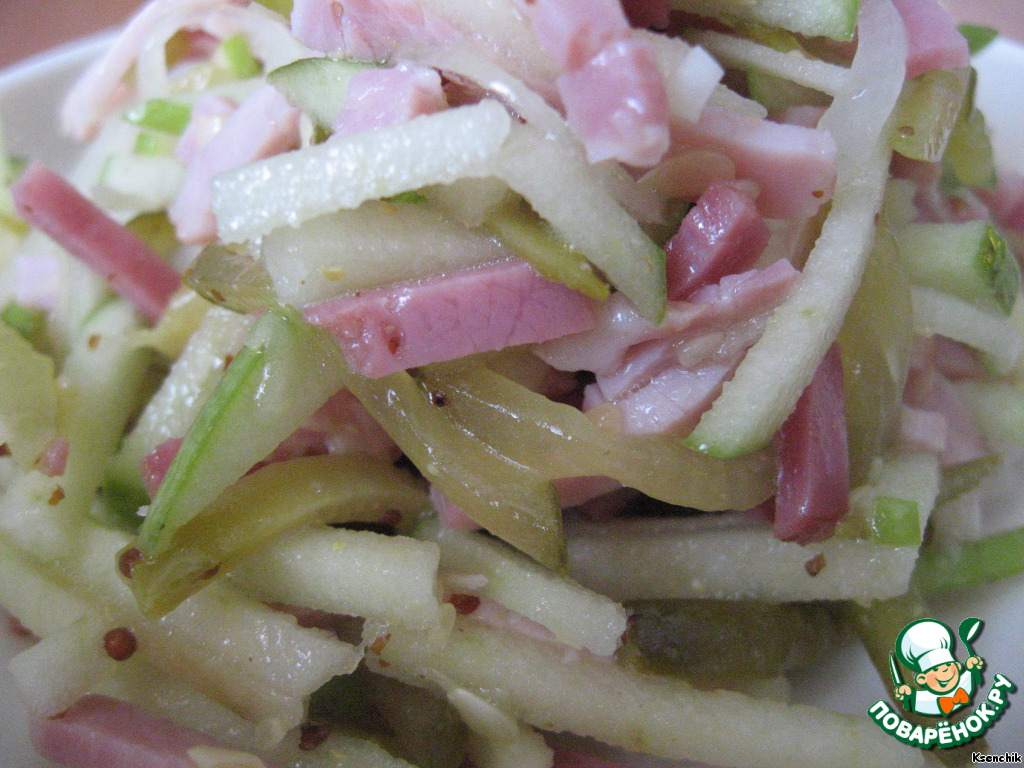 Буженину, маринованные огурцы нарезать небольшими брусочками.