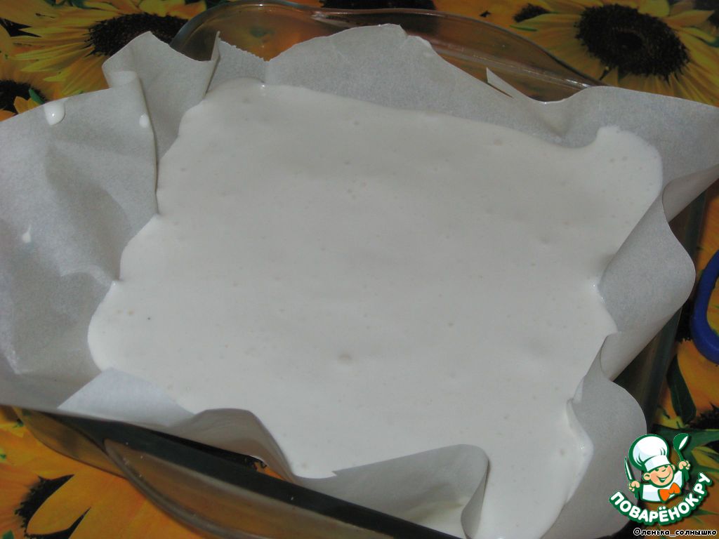 Вылить в форму застеленную пергаментом (можно разделить на части и подкрасить соком или пищевыми красителями) и поставить в холодильник на 2 часа для застывания (масса застынет, но будет очень липкой)
