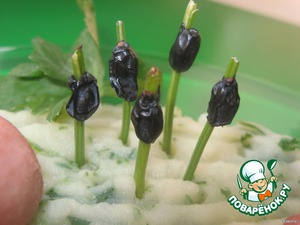 Из стеблей петрушки и барбариса делаем "камыш". Втыкаем в пюре. Листьями петрушки обкладываем пюре - это "кусты".