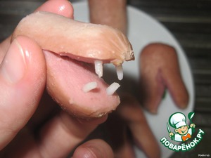 Сосиску надрезаем посередине на половину длины. В получившийся "рот" вставляем рисинки - "зубы".