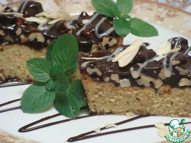 На фото хорошо видна хрупкость и рассыпчатость песочного теста, куча орехов и просто море (с волнами) шоколада!