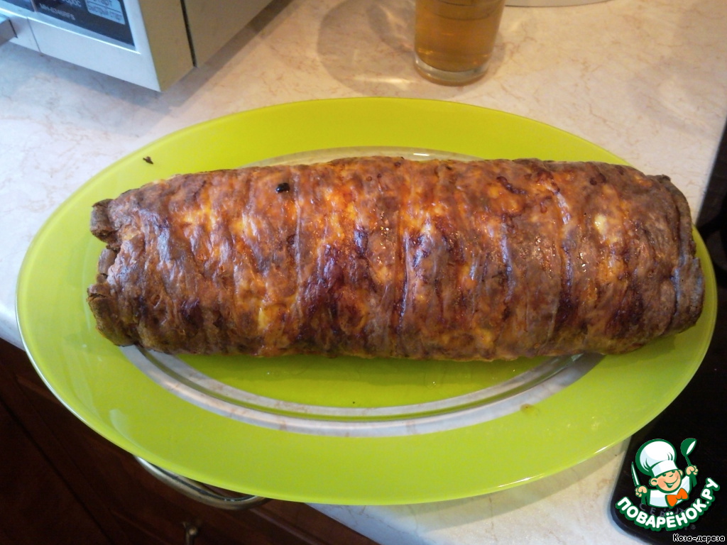Свернуть рулетом, аккуратно отделяя омлет от пергамента. Если омлет пропекся хорошо, отделяется замечательно. Расположить рулет посередине противня на пергаменте. Запекать в духовке при 180С в течение 40 минут.
