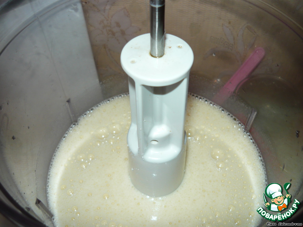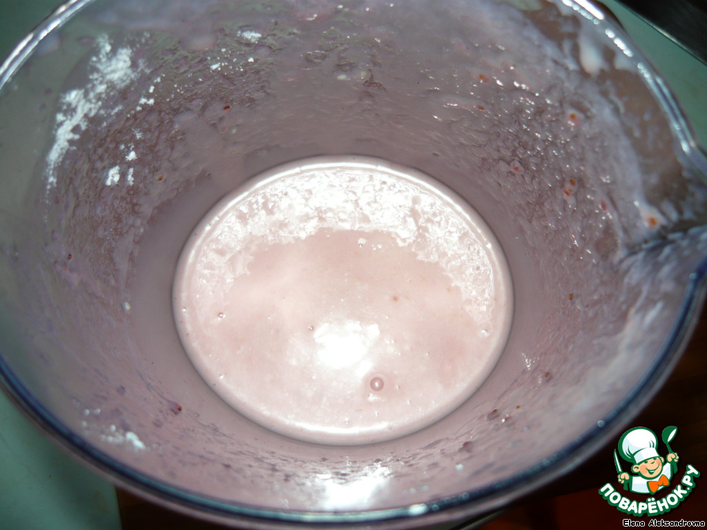 Сливки + клубнику + 1 нарезанный банан + 150г сахарной пудры = закладываем в блендер и тщательно-претщательно перемешиваем, взбиваем минут 5. Процедим массу через сито для того, чтобы эта вкусная масса стала однородной. Взобьем еще разок 5 минут. Ставим на холод для загустения. Остатки процеженные скушаем, потому что эти остатки очень вкусны.