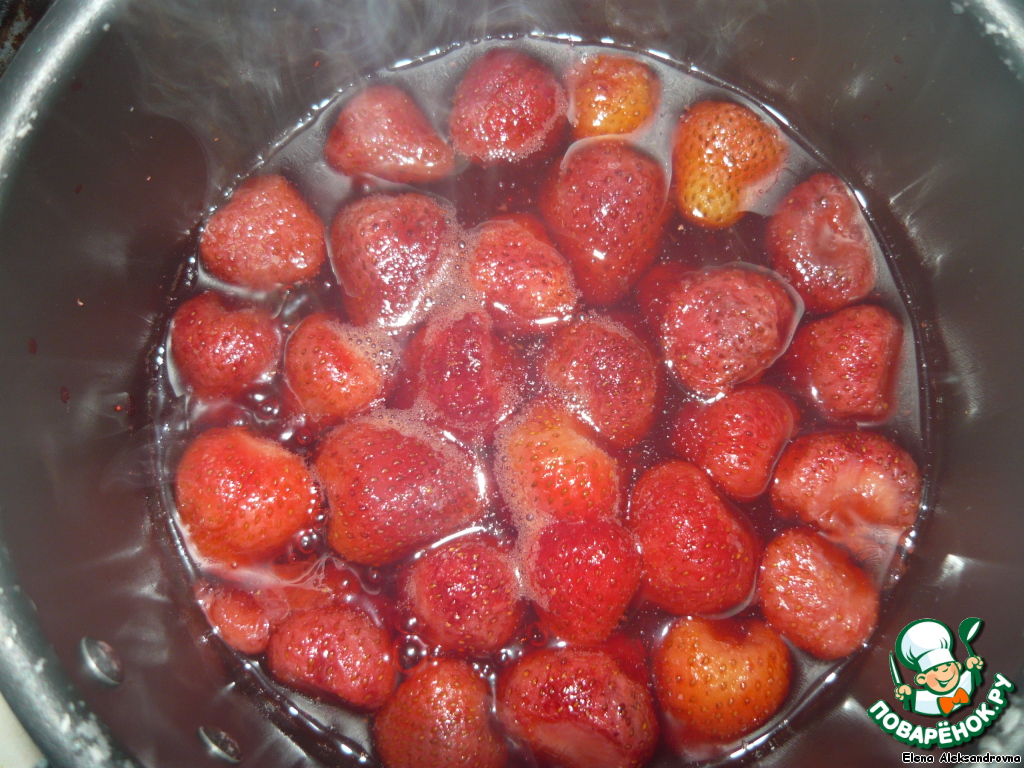 Давайте займемся КРЕМОМ! Клубнику провариваем в 3 ложках воды 5 минут. Жидкость сливаем в стаканчик - потом можно полакомиться.