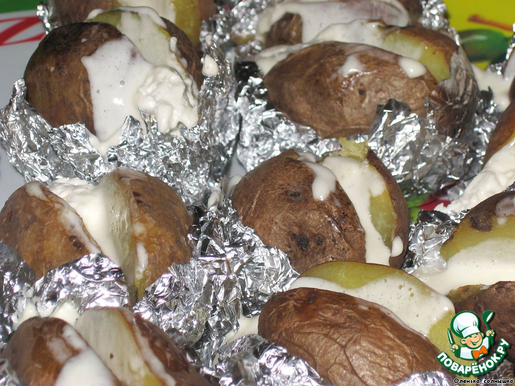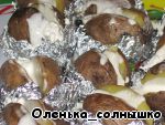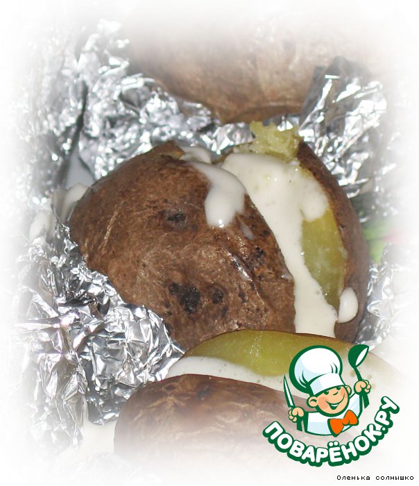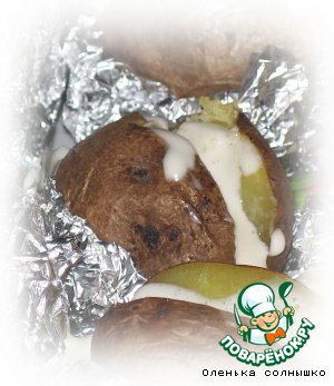 Картофель вынуть из духовки, разрезать вдоль на половинки (не до конца) и положить в каждую чайную ложку суфле. Оно начинает немного таять и пропитывает, таким образом, картофель