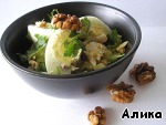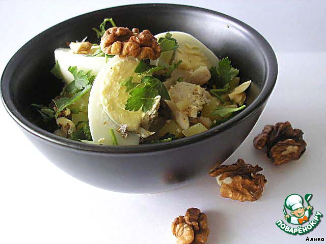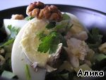 Салат посыпаем мелко нарезанной зеленью, сверху украшаем дольками яиц и половинками грецкого ореха.