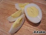 Яйца нарезаем дольками, половинки грецкого ореха измельчаем ножом (оставьте несколько штук для украшения).