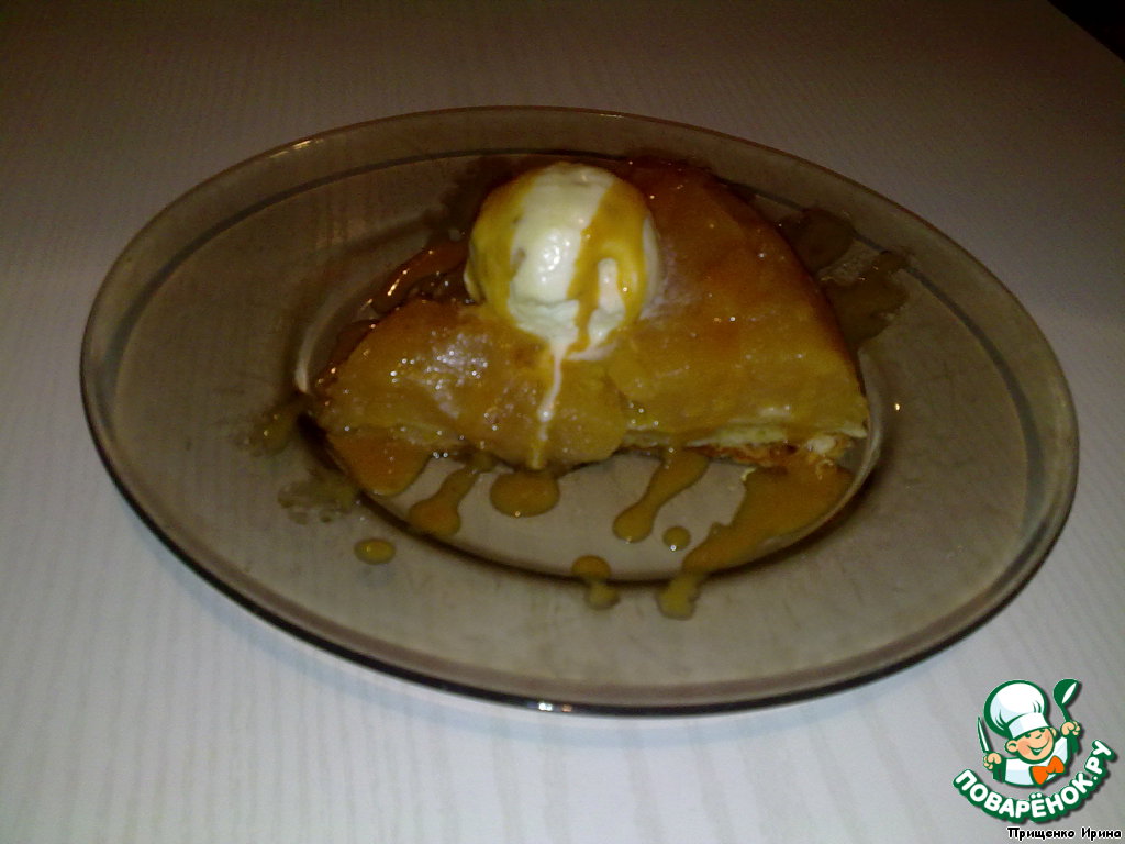 • Подаем порционно. Предварительно подогрев в микроволновой печи (достаточно 45 сек.). Украшаем шариком сливочного мороженого и карамельным соусом. Ву-а-ля! Наш классический американский яблочный пирог готов!!!