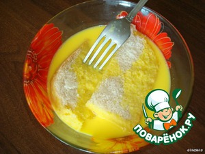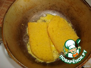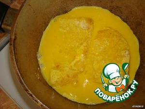 На разогретую сковороду капнуть подсолнечного масла. Выложить пропитанные кусочки хлеба. Немного подрумянить. Перевернуть.