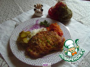 На припущенный рис положить готовую отбивную, полить ее томатным соусом и положить вторую отбивную (если отбивные маленькие), посыпав измельченной цедрой лайма (лимона). Я не использовала томатный соус, который написан в рецепте, у меня было домашнее лечо и салатик из огурцов.