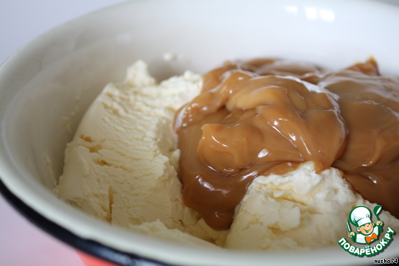 Маскарпоне соединить с вареной сгущенкой, и все взбить.